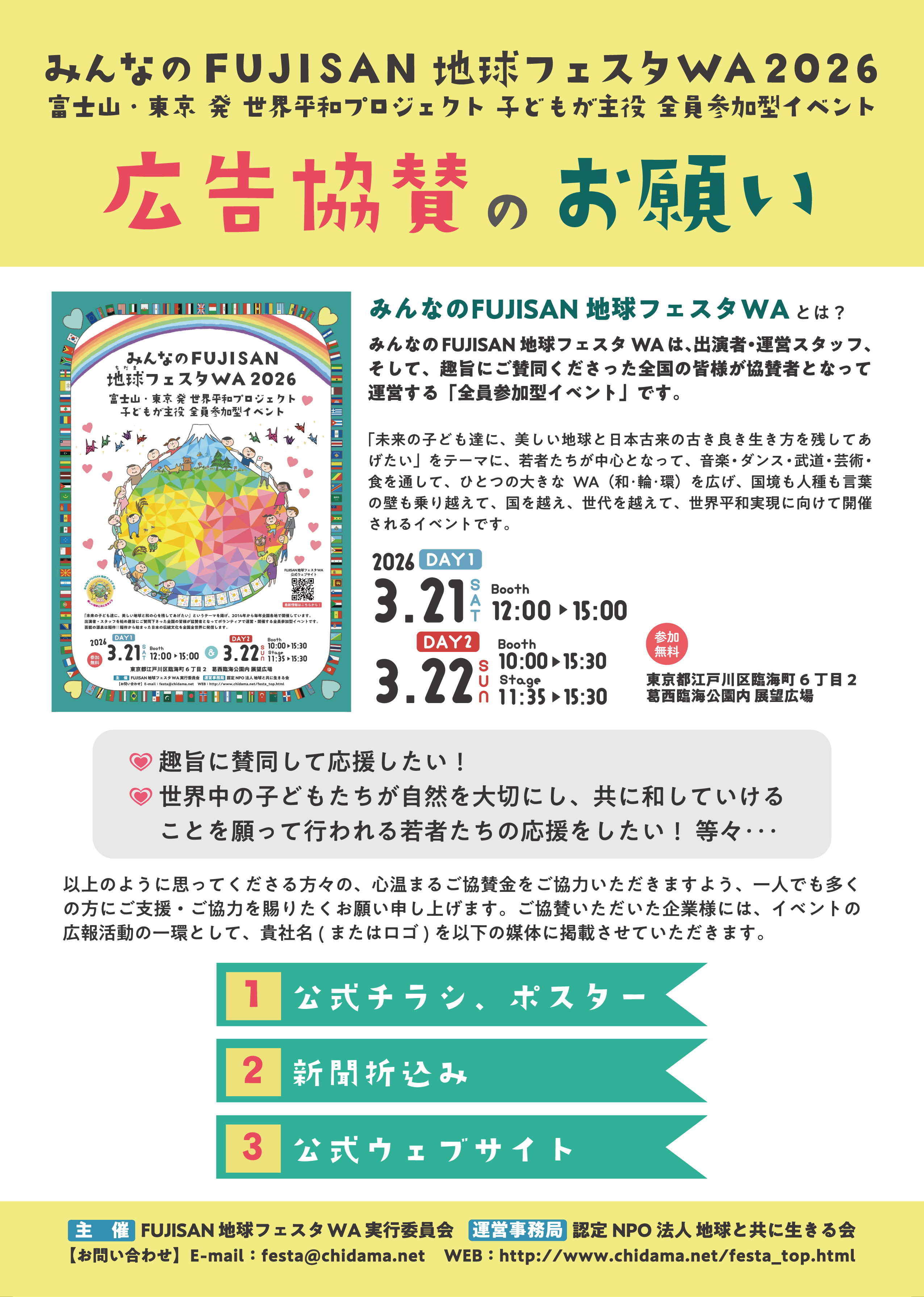 つきましては、何卒、本趣旨にご賛同いただき、皆様の支援の輪がひろがることで「みんなのFUJISAN 地球フェスタ WA 2025富士山・東京」を盛り上げてまいりたいと存じますので、不況といわれる経済環境の中、是非ともご協賛を賜りますよう重ねてお願い申し上げます。